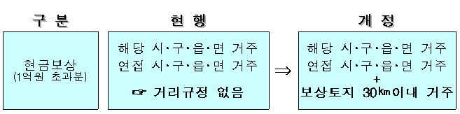 ±¹Åä±³ÅëºÎ(Àå°ü : ¼½Âȯ)´Â º¸»ó´ë»ó ÅäÁö¿¡¼ 30§° À̳»¿¡ °ÅÁÖÇØ ¿Â ÅäÁö¼ÒÀ¯ÀÚ¿¡°Ô Çö±Ýº¸»óÀÌ °¡´ÉÇϵµ·Ï ÇÏ´Â °Í µîÀ» ÁÖ¿ä³»¿ëÀ¸·Î Çϴ¡¸°øÀÍ»ç¾÷À» À§ÇÑ ÅäÁö µîÀÇ Ãëµæ ¹× º¸»ó¿¡ °üÇÑ ¹ý·ü ½ÃÇà·É¡¹°³Á¤¾ÈÀÌ ±¹¹«È¸ÀÇ¿¡¼ Àǰá(12.17) µÇ¾ú´Ù°í ¹àÇû´Ù. À̹ø °³Á¤¾ÈÀÇ ÁÖ¿ä³»¿ëÀº ´ÙÀ½°ú °°´Ù.