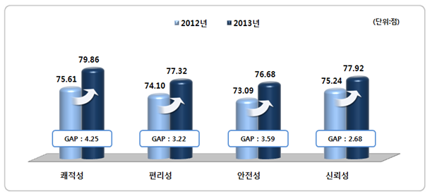 ¿ÃÇØ ½Ã³»¹ö½º¿¡ ´ëÇÑ Àü¹ÝÀûÀÎ ¸¸Á·µµ´Â 78.10Á¡À¸·Î 2012³â 74.30Á¡ ´ëºñ 3.80Á¡(5.1%) »ó½ÂÇßÀ¸¸ç, ¸¶À»¹ö½º´Â ºñ½ÁÇÑ ¼öÁØ(2012³â 76.71Á¡→ 2013³â 76.28Á¡)ÀÎ °ÍÀ¸·Î Á¶»çµÆ´Ù.