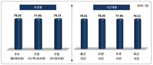 ¹Ý´ë·Î ▴Æí¸®¼º¿¡¼ ±³Åë¾àÀÚ ÆíÀǽü³(76.48Á¡) ▴¾ÈÀü¼º¿¡¼ ¾ÈÀü¿îÇà(75.75Á¡), ±³Åë¹ý±Ô Áؼö(76.19Á¡) µîÀÇ Ç׸ñÀÌ °¡Àå ³·Àº Á¡¼ö¸¦ ¹Þ¾Ò´Ù. ¿äÀÏ․½Ã°£´ëº°·Î ¸¸Á·µµ´Â Å« Â÷ÀÌ´Â ¾øÀ¸³ª ÁÖ¸»(78.15Á¡)º¸´Ù´Â ÁÖ ÃʹÝ(78.20Á¡), ‘10~12½Ã’ ¿ÀÀü½Ã°£´ë(78.26Á¡) ¸¸Á·µµ°¡ ´Ù¼Ò ³ô¾Ò´Ù.