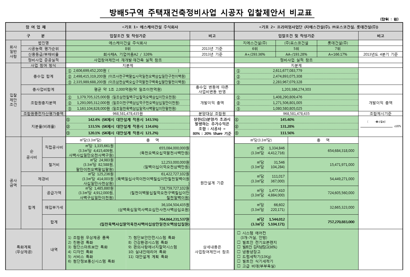 ÃÑ °ø»çºñ´Â ¡ãÇÁ¸®¹Ì¾ö»ç¾÷´ÜÀÌ 7572¾ï7088¸¸3000¿øÀ» ¡ãSK°Ç¼³ÀÌ 7648¾ï6423¸¸1537¿øÀ» °¢°¢ Á¦½ÃÇß´Ù. ¹«ÀÌÀÚ ÀÌÁÖºñÀÇ °æ¿ì ¾çÃø ¸ðµÎ °¡±¸´ç 4¾ï3000¸¸¿øÀ» Á¦¾ÈÇß´Ù.