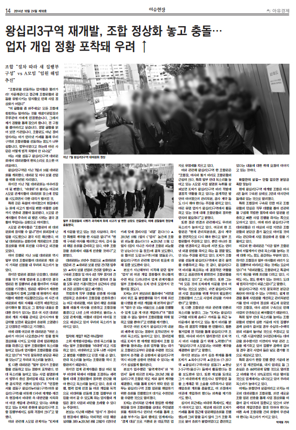 ÀÌ¿Í °ü·ÃÇØ ¿Õ½Ê¸®3±¸¿ª ÇÑ Á¶ÇÕ¿øÀº “Á¶ÇÕÀå, ÀÌ»çÀÇ Ã¶°Å ºñ¸®·Î Á¶ÇÕ¿øµéÀÇ ±Ù½ÉÀÌ Å©´Ù. ƯÈ÷ ÀϺΠ¹Ý´ë ¸ñ¼Ò¸®¸¦ ³ôÀ̰í ÀÖ´Â A¸ðÀÓ »ç¾÷ ¼³¸íȸ ³ìÃ븦 »ìÆìº¸¸é K¾¾°¡ ¿Õ½Ê¸®3±¸¿ª ºñ¸® Àû¹ß¿¡ °áÁ¤Àû ¿ªÇÒÀ» Çϰí ÀÖ´Ù´Â °ø°³ÀûÀÎ ¹ß¾ðÀÌ À̾îÁ³À¸¸ç °ü¸®Ã³ºÐ, °ø»ç °è¾à µîµµ ´Ù½Ã ÇØ¾ß ÇÑ´Ù´Â ÁÖÀåÀ» ÆîÄ¡°í ÀÖ´Ù. ÀÌ·± À¯¸í ¾÷ÀÚ°¡ ¿Õ½Ê¸®3±¸¿ª¿¡¼ Ȱµ¿Çϰí ÀÖ´Â °Í¿¡ ´ëÇØ Á¶ÇÕ¿øµéÀÇ Á¤È®ÇÑ ÀνÄÀÌ ÇÊ¿äÇÏ´Ù”°í ¹àÇû´Ù.