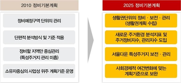 2025 Á¤ºñ±âº»°èȹ¿¡´Â º¸ÀüÀÌ ÇÊ¿äÇÑ Æ¯¼º ÁÖ°ÅÁöÀÇ °ü¸®, ¿ª»ç¹®ÈÀ¯»ê(ÈçÀû)À» ³²±â°í Ȱ¿ëÇÏ´Â Á¤ºñ»ç¾÷ µî °¡À̵å¶óÀεµ Æ÷ÇԵƴÙ. ´Ü 2010 Á¤ºñ±âº»°èȹ¿¡ ÀÇÇÑ ±âÁ¸ Á¤ºñ¿¹Á¤±¸¿ªÀº ÁÖ°ÅÁ¤ºñÁö¼ö Àû¿ë ¾øÀÌ Á¾Àü °èȹ ³»¿ë¿¡ µû¶ó Á¤ºñ°èȹ ¼ö¸³ÀÌ °¡´ÉÇÏ´Ù.