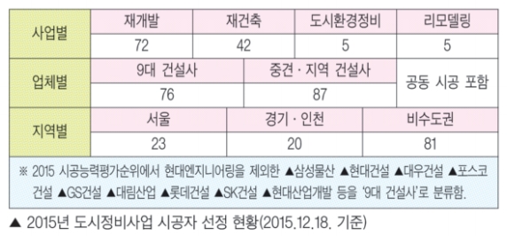 ÇöÀç±îÁö ½Ã°øÀÚ¸¦ ¼±Á¤ÇÑ °÷À» Áö¿ªº°·Î ±¸ºÐÇÏ¸é ¼¿ï 23°÷(¡ãÀç°³¹ß 8°÷ ¡ãÀç°ÇÃà 10°÷ ¡ã¸®¸ðµ¨¸µ 4°÷ ¡ãµµ½Ãȯ°æÁ¤ºñ 1°÷), ÀÎõ¤ý°æ±â 20°÷(¡ãÀç°³¹ß 12°÷ ¡ãÀç°ÇÃà 7°÷ ¡ã¸®¸ðµ¨¸µ 1°÷), Áö¹æ 81°÷(¡ãÀç°³¹ß 52°÷ ¡ãÀç°ÇÃà 25°÷ ¡ãµµ½Ãȯ°æÁ¤ºñ 4°÷) µîÀ¸·Î Á¶»çµÆ´Ù.