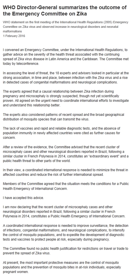 ¸¶°Å¸´ æ(Margaret Chan) WHO »ç¹«ÃÑÀåÀº “À§Çù ¼öÁØÀ» Æò°¡ÇÑ °á°ú, ´Ù¼ö Àü¹®°¡µéÀÌ ÁöÄ«¹ÙÀÌ·¯½º °¨¿°°ú È®»ê ÁßÀÎ ¼±Ãµ¼º ±âÇü ¹× ½Å°æ°è ÇÕº´Áõ »çÀÌ¿¡ °ÇÑ ¿¬°ü¼ºÀÌ ÀÖ´Ù°í ÆÇ´ÜÇß´Ù”¸é¼ “ƯÈ÷ À̵éÀº ÀӽŠ±â°£ µ¿¾ÈÀÇ ÁöÄ«¹ÙÀÌ·¯½º °¨¿°°ú ¼ÒµÎÁõ(microcephaly)ÀÇ Àΰú°ü°è°¡ °ÇÏ°Ô Àǽɽº·´´Ù´Â µ¥ µ¿ÀÇÇß´Ù”°í ¹àÇû´Ù.