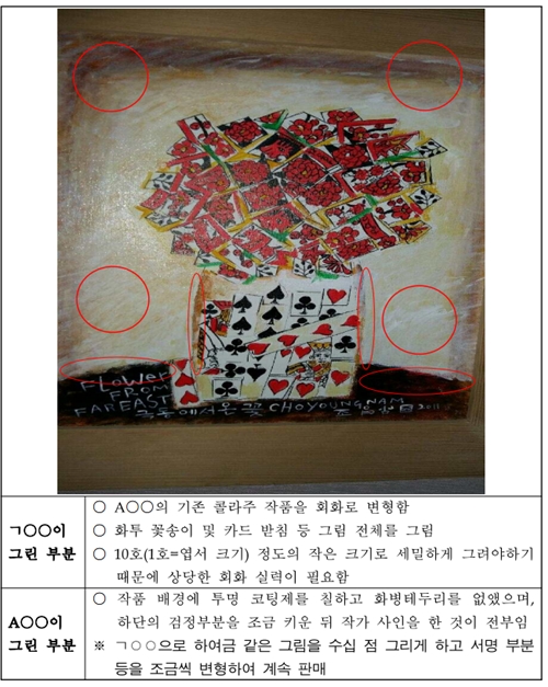 °ËÂû Á¶»ç °á°ú Á¶¾¾´Â ÀÛǰ 1Á¡´ç 10¸¸ ¿øÀ» ÁÖ°í ÁÖ¹®ÇÑ ±×¸²À» °æ¹ÌÇÑ µ¡Ä¥ ÀÛ¾÷ ÈÄ 30¸¸~50¸¸ ¿ø¿¡ ÆÇ¸ÅÇÏ´Â ¼ö¹ýÀ¸·Î 20¸í¿¡°Ô 26Á¡ÀÇ ´ëÀÛ ±×¸²À» ÆÈ¾Æ 1¾ï8035¸¸ ¿øÀ» ì±ä °ÍÀ¸·Î µå·¯³µ´Ù. ¸Å´ÏÀú ¶ÇÇÑ 2015³â 2¿ùºÎÅÍ ÀÌ¿¡ °¡´ãÇØ 2680¸¸ ¿øÀÇ ºÎ´çÀ̵æÀ» ÆíÃëÇß´Ù°í °ËÂû °ü°èÀÚ´Â ÀüÇß´Ù.