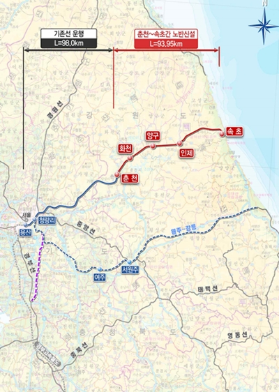 Ãáõ~¼ÓÃÊ Ã¶µµ °Ç¼³»ç¾÷Àº Ãáõ¿¡¼ºÎÅÍ Èõ, ¾ç±¸, ÀÎÁ¦, ¼ÓÃʱîÁö 93.9km ´Ü¼± ÀüöÀ» °Ç¼³ÇÏ´Â »ç¾÷À¸·Î, 2Á¶631¾ï ¿øÀÇ Àç¿øÀÌ ÅõÀ﵃ ¿¹Á¤ÀÌ´Ù.