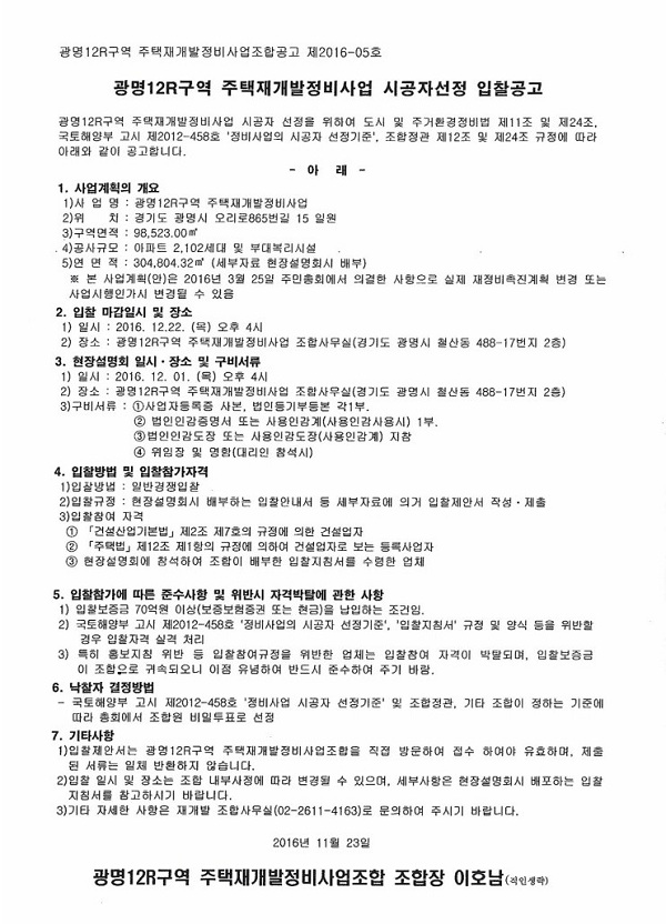 29ÀÏ ±¤¸í12R±¸¿ª Àç°³¹ß Á¤ºñ»ç¾÷Á¶ÇÕ(Á¶ÇÕÀå ÀÌÈ£³²¤ýÀÌÇÏ Á¶ÇÕ)¿¡ µû¸£¸é Á¶ÇÕÀº Áö³ 23ÀÏ ½Ã°øÀÚ ¼±Á¤À» À§ÇÑ ÀÔÂû°ø°í¸¦ ³Â´Ù.