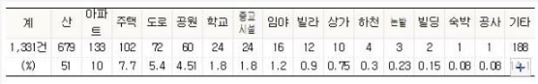 Àå¼Òº°·Î´Â µî»ê·Î¿Í °°Àº »ê¿¡¼ 356°Ç(51%)ÀÌ ³ªÅ¸³ª °¡Àå Á¶½ÉÇØ¾ß ÇÒ Àå¼Ò·Î ²ÅÇû´Ù. ÀÌ¾î ¾ÆÆÄÆ®(133°Ç, 10%), ÁÖÅÃ(102°Ç, 7.7%), µµ·Î(72°Ç, 5.4%), °ø¿ø(60°Ç, 4.51%) ¼øÀ¸·Î »ýȰ ÁÖº¯ ´Ù¾çÇÑ Àå¼Ò¿¡ Ãâ¸ôÇÑ °ÍÀ¸·Î ³ªÅ¸³µ´Ù.