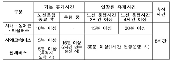 À̹ø ½ÃÇà·É¿¡ µû¶ó ¹ö½º¿îÀüÀÚ´Â ¾÷Á¾º° ¿îÇàÇüÅ¿¡ µû¶ó ÈÞ°Ô ½Ã°£À» º¸Àå¹Þ°Ô µÈ´Ù. ½Ã³»·³ó¾îÃÌ·¸¶À»¹ö½º ¿î¼öÁ¾»çÀÚ´Â ³ë¼± 1ȸ ¿îÇàÀ» ¸¶Ä£ µÚ ÃÖ¼Ò 10ºÐ ÀÌ»óÀÇ ÈÞ°Ô ½Ã°£À» °¡Á®¾ß ÇÑ´Ù. 1ȸ ³ë¼± ¿îÇà½Ã°£ÀÌ 2½Ã°£ ÀÌ»óÀÎ °æ¿ì ¿îÇà Á¾·á ½ÃÁ¡ºÎÅÍ 15ºÐ ÀÌ»ó, 4½Ã°£ ÀÌ»óÀÎ °æ¿ì 30ºÐ ÀÌ»óÀÇ ÈÞ°Ô ½Ã°£À» º¸Àå¹Þ´Â´Ù.