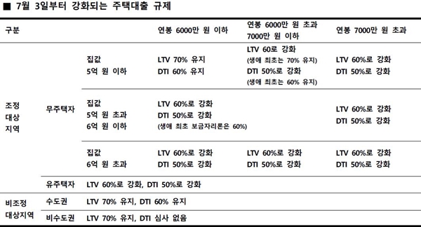±¸Ã¼ÀûÀ¸·Î º¸¸é Á¶Á¤´ë»óÁö¿ª 40°÷ÀÇ ½Ç¼ö¿äÀÚ Áß ¼¹Î ´ë»ó Á¤Ã¥¸ð±âÁöÀÎ µðµõµ¹´ëÃâ ÀÚ°Ý ¿ä°ÇÀ» ÃæÁ·ÇÏ´Â À̵éÀº 6¤ý19 ºÎµ¿»ê ´ëÃ¥¿¡µµ ±âÁ¸ÀÇ ±ÝÀ¶ ±ÔÁ¦¸¦ Àû¿ë¹Þ°Ô µÈ´Ù. Áý°ªÀÌ 5¾ï ¿ø ÀÌÇÏÀ̰í, ºÎºÎ ÇÕ»ê ¼ÒµæÀÌ 6000¸¸ ¿ø ÀÌÇÏ(»ý¾Ö ÃÖÃÊ ÁÖÅà ±¸ÀÔÀÚ´Â 7000¸¸ ¿ø ÀÌÇÏ)ÀÎ ¹«ÁÖÅà °¡±¸ÁÖ´Â Á¶Á¤´ë»óÁö¿ª ÁÖÅÃÀ» ±¸ÀÔÇÏ´õ¶óµµ Á¾ÀüÀÇ LTV(70%), DTI(60%) ±ÔÁ¦¸¦ Àû¿ë¹Þ´Â´Ù. »ý¾Ö ÃÖÃÊ ÁÖÅà ±¸ÀÔÀÚ´Â ¿¬ºÀ 7000¸¸ ¿ø ÀÌÇϱîÁö °È ÀÌÀüÀÇ LTV, DTI ±ÔÁ¦¸¦ Àû¿ë¹Þ´Â´Ù.