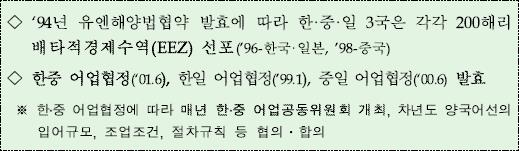 À̹ø ±¹Àå±Þ ȸ´ã¿¡¼´Â ³»³âµµ ÇѤýÁß EEZÀÇ ÀÔ¾î ô¼ö¤ý¾îȹÇÒ´ç·®, ÀÔ¾î ÀýÂ÷ µîÀ» ³íÀÇÇϰí, Áß±¹ ¾î¼±ÀÇ ºÒ¹ý Á¶¾÷ °³¼± ¹æ¾ÈÀ» ³íÀÇÇÑ´Ù.
