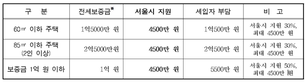 ¼¿ï½Ã´Â Àü¿ù¼¼ °¡°Ý»ó½ÂÀ¸·Î ÁÖ°Å»ýȰ¿¡ ¾î·Á¿òÀ» °Þ°í ÀÖ´Â ÃÖÀú ÁÖ°Å»ýȰÀÚÀÇ ÁְžÈÁ¤¿¡ µµ¿òÀ» ÁÖ°íÀÚ Àü¿ù¼¼ º¸Áõ±ÝÀÌ 1¾ï ¿ø ÀÌÇÏ¿¡ ÇØ´çÇÏ´Â °æ¿ì¿¡´Â Áö¿ø ±Ý¾×À» Àü¿ù¼¼ º¸Áõ±ÝÀÇ 50%, ÃÖ´ë 4500¸¸ ¿ø±îÁö·Î »óÇâ Áö¿øÅä·Ï Çϰí ÀÖ´Ù.