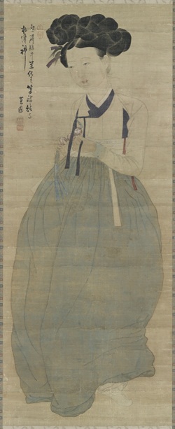 ‘½ÅÀ±º¹ ÇÊ ¹ÌÀεµ(ãéëÈÜØ ù¶ Ú¸ìÑÓñ)’´Â Á¶¼± Èıâ dz¼ÓÈ¿¡ ÀÖ¾î ±èÈ«µµ¿Í ½Öº®À» ÀÌ·é ½ÅÀ±º¹(1758³â°æ~1813³â ÀÌÈÄ)ÀÌ ¿©ÀÎÀÇ Àü½Å»ó(îïãóßÀ)À» ±×¸° ÀÛǰÀÌ´Ù. È¸é ¼Ó ¿©ÀÎÀº ¸Ó¸®¿¡ °¡Ã¼¸¦ ¾ñ°í ȸÀåÀú°í¸®¿¡ dz¼ºÇÑ Ä¡¸¶¸¦ ÀÔ°í Àִµ¥ ÀÌó·³ ¿©ÀÎÀÇ Àü½Å»óÀ» ±×¸° ¹ÌÀεµ´Â ½ÅÀ±º¹ ÀÌÀü¿¡´Â ³²¾Æ ÀÖ´Â ¿¹°¡ °ÅÀÇ ¾ø´Ù. ÀÌ ÀÛǰÀº 19¼¼±âÀÇ ¹ÌÀεµ Á¦ÀÛ¿¡ ÀÖ¾î ÀüÇü(îðúþ)À» Á¦½ÃÇß´Ù´Â Á¡¿¡¼ ÇмúÀû‧¿¹¼úÀû ÀÇÀǰ¡ Å©¸ç, ÇÊÄ¡³ª Èdz¿¡¼µµ ½ÅÀ±º¹ÀÇ È¸È¸¦ ´ëÇ¥ÇÏ´Â ÀÛǰÀÌ´Ù.