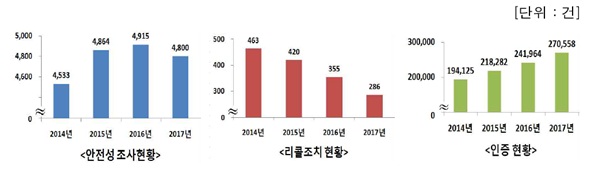 Á¦Ç° ¼ö°Å¤ý±³È¯ µîÀÇ ¸®Äݸí·É °Ç¼ö´Â 2014³â ÀÌÈÄ ¸Å³â °¨¼Ò Ãß¼¼Áö¸¸ Á¦Ç°ÀÇ Ã·´Ü¤ýÀ¶º¹ÇÕÈ ¹× ¼öÀÔÁ¦Ç° Áõ°¡¿¡ µû¶ó ¾ÈÀüÀÎÁõ µî·Ï°Ç¼ö°¡ °è¼Ó Áõ°¡Çϰí ÀÖ¾î ±¹Ç¥¿øÀº ÀÌ·¯ÇÑ ½ÃÀå º¯È¿¡ Àû±Ø ´ëÀÀÇÒ ¼ö ÀÖµµ·Ï ¾ÈÀü¼ºÁ¶»ç¸¦ È®´ëÇØ ³ª°£´Ù´Â ±¸»óÀÌ´Ù.
