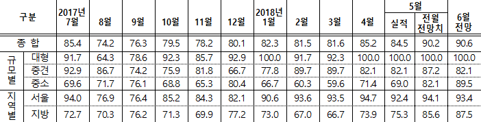 [¾ÆÀ¯°æÁ¦=±èÇÐÇü ±âÀÚ] Áö³´Þ(5¿ù) °Ç¼³»ê¾÷ °æ±â½Ç»çÁö¼ö(CBSI)°¡ ¿ÃÇØ 4¿ùº¸´Ù 0.7Æ÷ÀÎÆ® Ç϶ôÇÑ 84.5·Î Áý°èµÆ´Ù.