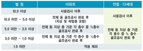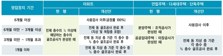 ¼±ºÐ¾ç Á¦ÇÑÀÌ Àû¿ëµÇ´Â ¿µ¾÷Á¤Áö »çÀ¯´Â ¡¸ÁÖÅùý ½ÃÇà·É¡¹ »ó 3°³ »çÀ¯¿¡¼ ºÎ½Ç½Ã°ø°ú °ü·ÃµÈ 23°³ »çÀ¯(¡¸ÁÖÅùý ½ÃÇà·É¡¹ °ú ¡¸°Ç¼³»ê¾÷±âº»¹ý ½ÃÇà·É¡¹ Æ÷ÇÔ)·Î È®´ëµÈ´Ù. ¼±ºÐ¾ç Á¦ÇÑ ¼öÁØÀº ¿µ¾÷Á¤Áö ±â°£°ú ´©°è Æò±Õ¹úÁ¡ Á¤µµ¿¡ µû¶ó ´Ü°èÀûÀ¸·Î Àû¿ëµÈ´Ù. ÇöÀç ¼±ºÐ¾ç °ü·Ã ±âÁØÀº ¿µ¾÷Á¤Áö ±â°£°ú »ó°ü¾øÀÌ ¾ÆÆÄÆ® Àý¹Ý ÀÌ»ó¿¡ ÇØ´çÇÏ´Â Ãþ¼öÀÇ °ñÁ¶°ø»ç ¿Ï·á ½ÃÁ¡¿¡ ÀÔÁÖÀÚ ¸ðÁýÀÌ °¡´ÉÇÏ´Ù´Â ³»¿ë¸¸ ÀÖ´Ù. À̹ø °³Á¤¾ÈÀÌ ½ÃÇàµÇ¸é ÃÖ¼Ò ‘Àüü µ¿ Áö»ó Ãþ ±âÁØ °¢ Ãþ¼ö Áß 3ºÐÀÇ 1 Ãþ¼ö °ñÁ¶°ø»ç ¿Ï·á ÈÄ’¿¡¼ ÃÖ´ë ‘»ç¿ë°Ë»ç ÀÌÈÄ’±îÁö·Î ¼¼ºÐÈÇØ ¿µ¾÷Á¤Áö ±â°£ÀÌ ±æ°Å³ª ´©°è Æò±Õ¹úÁ¡ÀÌ ³ôÀº °æ¿ì ¼±ºÐ¾ç Á¦ÇÑ ¼öÁØÀÌ °ÈµÈ´Ù. µ¿ÀÏ ¾÷ü°¡ ¼±ºÐ¾ç Á¦ÇÑÀÌ Àû¿ëµÇ´Â ¿µ¾÷Á¤Áö óºÐÀ» ¹Ýº¹Çؼ ¹Þ¾ÒÀ» ¶§¿¡´Â ¿µ¾÷Á¤Áö ±â°£À» ÇÕ»êÇØ ¼±ºÐ¾ç Á¦ÇÑ ±âÁØÀ» Àû¿ëÇÑ´Ù.