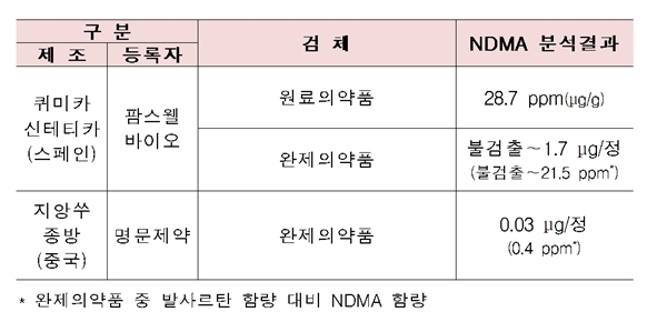 ½Ä¾àó´Â Áö³ 6ÀÏ 41°³ ǰ¸ñ¿¡ ´ëÇÑ Áß°£Á¶»ç °á°ú ¹ßÇ¥ ÀÌÈÄ ³ª¸ÓÁö ‘¹ß»ç¸£Åº’ ¿ø·áÀǾàǰ 45°³ ǰ¸ñÀ» ¼ö°Å¤ý°Ë»çÇÑ °á°ú, 2°³ ǰ¸ñ¿¡¼ ‘NDMA’ ±âÁØÀ» ÃʰúÇÑ °ÍÀ¸·Î È®ÀÎµÆ´Ù°í ¹àÇû´Ù.
