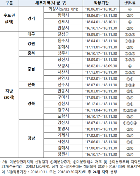ÇÑÆí, °°Àº ³¯ HUG´Â Á¦24Â÷ ¹ÌºÐ¾ç °ü¸®Áö¿ªÀ¸·Î ¼öµµ±Ç 4°³ ¹× Áö¹æ 20°³, ÃÑ 24°³ Áö¿ªÀ» ¼±Á¤¤ý¹ßÇ¥Çß´Ù. Áö³´Þ(8¿ù) ¼±Á¤µÈ Á¦23Â÷ ¹ÌºÐ¾ç°ü¸®Áö¿ª(22°³)¿¡¼ ´ë±¸ ´Þ¼º±º, Ãæ³² ´çÁø½Ã 2°÷ÀÌ ¹ÌºÐ¾ç Áõ°¡ µîÀÇ »çÀ¯·Î Ãß°¡µÆ´Ù.
