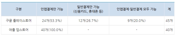 À¯·á ÄÜÅÙÃ÷¸¦ ÆÇ¸ÅÇÏ´Â ¸ð¹ÙÀÏ ¾ÛÀÇ °áÁ¦¹æ¹ýÀ» »ìÆìº» °á°ú, ±¸±Û ¾Û¸¶ÄÏ µî·Ï ¾Û(45°³)ÀÇ °æ¿ì ‘Àξ۰áÁ¦’¸¸ °¡´É 24°³, ‘ÀϹݰáÁ¦(½Å¿ëÄ«µå, ÈÞ´ëÆù °áÁ¦ µî)’¸¸ °¡´É 12°³, ‘Àξ۰áÁ¦¤ýÀϹݰáÁ¦ ¸ðµÎ °¡´É’ÀÌ 9°³¿´°í, ¾ÖÇà ¾Û¸¶ÄÏ µî·Ï ¾Û(40°³)Àº ¸ðµÎ ‘Àξ۰áÁ¦’¸¸ °¡´ÉÇØ °áÁ¦¹æ¹ý¿¡ ÀÖ¾î ¼ÒºñÀÚÀÇ ¼±ÅñÇÀÌ Á¦Çѵǰí ÀÖ¾ú´Ù.