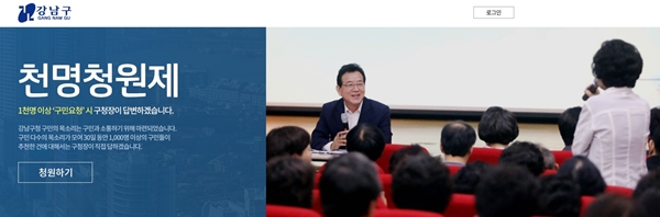 ‘õ¸í û¿ø’ °Ô½ÃÆÇÀº ±¸Ã» ȨÆäÀÌÁö¿¡ ½Å¼³µÅ ±¸¹Î ´©±¸³ª »çȸÀû À̽´³ª ±¸Á¤ °ü·Ã ÀïÁ¡, Á¤Ã¥ °ÇÀÇ»çÇ× µîÀ» û¿øÇÒ ¼ö ÀÖ´Ù. û¿ø ±ÛÀº ÇØ´ç ºÎ¼ÀÇ ÀûÁ¤¼º °ËÅä ÈÄ °ø°³µÇ¸ç, °ø°³µÈ ³¯ºÎÅÍ 30ÀÏ À̳»¿¡ 1000¸í ÀÌ»óÀÌ µ¿ÀÇÇϸé 30ÀÏ À̳»¿¡ ±¸Ã»ÀåÀÌ Á÷Á¢ ´äº¯ÇÑ´Ù. ¹Î¼±7±â °ø¾à»çÇ×À̱⵵ ÇÑ ‘õ¸í û¿ø’ÀÇ ¿ÀÇÁ¶óÀΠû¿øÀº Áö³ 8¿ùºÎÅÍ ½ÃÇàµÅ Áö±Ý±îÁö 6°ÇÀÌ Á¢¼ö·Ã³¸®µÇ°í ÀÖ´Ù.