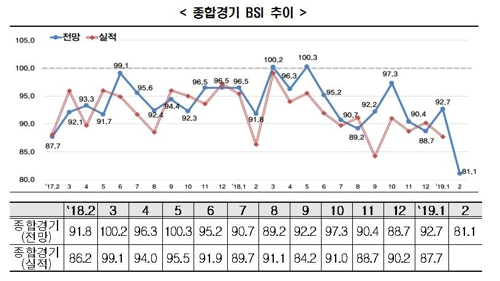 29ÀÏ Çѱ¹°æÁ¦¿¬±¸¿ø(ÀÌÇÏ ÇѰ濬)¿¡ µû¸£¸é ¸ÅÃâ¾× ±âÁØ 600´ë ±â¾÷À» ´ë»óÀ¸·Î ½ÃÇàÇÑ ±â¾÷°æ±â½Ç»çÁö¼ö(BSI) Á¶»ç¿¡¼ ¿À´Â 2¿ù Àü¸ÁÄ¡´Â 81.1À» ±â·ÏÇÏ¸ç ±âÁؼ±ÀÎ 100¿¡ ¸ø ¹ÌÃÆ´Ù.