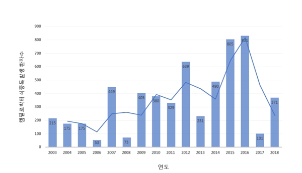 2003³â ÀÌÈÄ Ä·ÇʷιÚÅÍ·Î ÀÎÇÑ ½ÄÁßµ¶ ȯÀÚ´Â ÃÑ 5722¸íÀ¸·Î, ÇÏÀý±â¿¡ ÁýÁßÀûÀ¸·Î ¹ß»ýÇϰí ÀÖÀ¸¸ç ȯÀÚ ¼ö´Â Áõ°¡ Ãß¼¼´Ù.