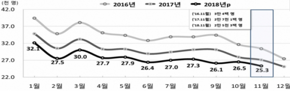 Ãâ»ý·üÀº Áö³ÇØ 10¿ù -5%¸¦ ±â·ÏÇѵ¥ À̾î 11¿ù¿¡µµ 6.6%(1800¸í) °¨¼ÒÇØ 2¸¸5300°Ç¿¡ ±×ÃÆ´Ù. Áö¿ªº°·Î´Â ¸ðµç ½Ã¤ýµµ°¡ °¨¼Ò ¹× À¯»çÇÑ °á°ú¸¦ ±â·ÏÇß´Ù. Ãâ»ý¾Æ ¼ö ÃÖÀúÄ¡¸¦ °æ½ÅÇÏ´Â °æ¿ì´Â 2016³â 4¿ùºÎÅÍ 32°³¿ù° À̾îÁö°í ÀÖ´Ù.