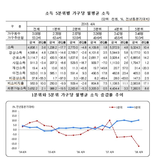 Åë°èûÀÌ ¾îÁ¦(21ÀÏ) ¹ßÇ¥ÇÑ ‘2018³â 4ºÐ±â °¡°èµ¿ÇâÁ¶»ç(¼ÒµæºÎ¹®) °á°ú’¿¡ µû¸£¸é Áö³ÇØ 4ºÐ±â °¡±¸´ç ¿ùÆò±Õ ¼ÒµæÀº 460¸¸6000¿øÀ¸·Î Àü³â µ¿±â(444¸¸5000¿ø)º¸´Ù 3.6%(16¸¸1000¿ø) ´Ã¾ú´Ù.