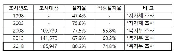 2018 Àå¾ÖÀÎÆíÀǽü³ ½ÇÅ Àü¼öÁ¶»ç °á°ú¿¡ µû¸£¸é, ÆíÀǽü³ ¼³Ä¡À²Àº 80.2% ÀûÁ¤¼³Ä¡À²Àº 74.8%·Î °¢°¢ ³ªÅ¸³µ´Ù. ÀÌ´Â Á÷Àü Á¶»ç³âµµÀÎ 2013³âµµ¿¡ ºñÇØ ¼³Ä¡À²Àº 12.3%p, ÀûÁ¤¼³Ä¡À²Àº 14.6%p ³ô¾ÆÁø °ÍÀ̸ç, óÀ½ Á¶»ç¸¦ ½Ç½ÃÇÑ 1998³âº¸´Ù ¼³Ä¡À²Àº ¾à 2¹è ¼öÁØÀ¸·Î ´Ã¾ú´Ù.