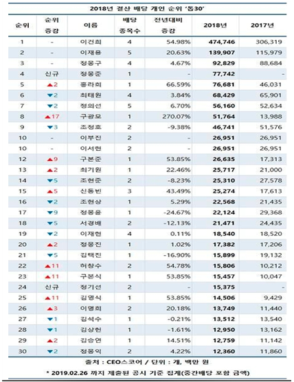 °³ÀÎ ¼øÀ§´Â 6À§ ÃÖÅ¿ø SK±×·ì ȸÀåÀ¸·Î SK°¡ ¹è´ç±Ý Áö±ÞÀ» È®´ëÇÏ¸é¼ 684¾ï ¿øÀ» ¹è´ç±ÝÀ¸·Î ¹Þ°Ô µÆ´Ù. À̾î Á¤ÀǼ± Çö´ëÂ÷±×·ì ¼ö¼®ºÎȸÀå(562¾ï ¿ø)Àº 7À§, ±¸±¤¸ð LG ȸÀå(517¾ï ¿ø)Àº 8À§¸¦ Â÷ÁöÇß´Ù. Á¶Á¤È£ ¸Þ¸®Ã÷±ÝÀ¶ ȸÀå(467¾ï ¿ø)Àº 9À§·Î µÚ¸¦ À̾ú´Ù.