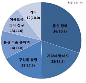 ÀÌ¿¡ µû¸£¸é »ó´ã Áß Åë½Å Àå¾Ö°¡ 36°Ç(30.3%)À¸·Î °¡Àå ¸¹¾Ò´Ù. °è¾à ÇØÁ¦¤ýÇØÁö(23°Ç, 19.3%), ±¸¼ºÇ° ºÒ·®(21°Ç, 17.6%), ºÐ½Ç¤ýÆÄ¼Õ µî¿¡ µû¸¥ ¼ÕÇØ¾×(14°Ç, 11.8%) µîÀÌ ±× µÚ¸¦ À̾ú´Ù.