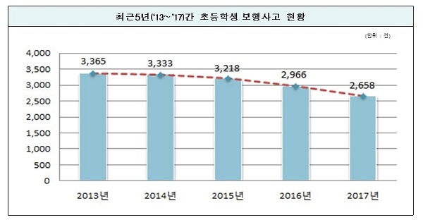 ÇàÁ¤¾ÈÀüºÎ°¡ ¹èÆ÷ÇÑ µµ·Î±³Åë°ø´Ü Åë°è´Â ÃÖ±Ù 5³â°£ ÃʵîÇлý º¸Çà»ç°í ÇöȲÀ» º¸¿©ÁÖ°í ÀÖ´Ù. 2013³âºÎÅÍ 2017³â »çÀÌÀÇ ÃʵîÇлý º¸ÇàÀÚ ±³Åë»ç°í ¹ß»ý°Ç¼ö´Â °¨¼ÒÃß¼¼À̳ª ¿©ÀüÈ÷ ¸¹Àº »ç°í°¡ ¹ß»ýÇϰí ÀÖÀ½À» ¾Ë ¼ö ÀÖ´Ù.