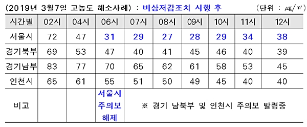 ÀÌ´Â ºÏdz °è¿ÀÇ ±â·ù À¯ÀÔ¿¡ ÀÇÇÑ ´ë±âÈ®»êÀ¸·Î Ãʹ̼¼¸ÕÁö ³óµµ°¡ ±Þ°ÝÇÏ°Ô °¨¼ÒÇÑ °ÍÀ¸·Î ÆÇ´ÜµÇ³ª ¼¿ï½Ã´Â ½Ã°¡ º¸´Ù °·ÂÇÑ °í³óµµ ¹Ì¼¼¸ÕÁö ºñ»óÀú°¨Á¶Ä¡¸¦ ½ÃÇàÇÑ °á°úµµ ÇÑ ¿øÀÎÀ¸·Î º¸°í ÀÖ´Ù. ¼¿ïÁö¿ªÀÇ ³·¾ÆÁø ³óµµ Â÷À̸¸Å ¹Ì¼¼¸ÕÁö ºñ»óÀú°¨Á¶Ä¡ÀÇ Àú°¨ È¿°ú°¡ ÀÖÀ» °ÍÀ¸·Î Àü¸ÁµÈ´Ù.