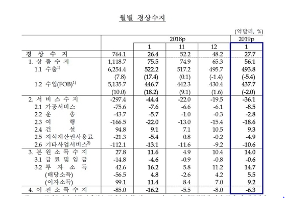 Çѱ¹ÀºÇà(ÀÌÇÏ ÇÑÀº)ÀÌ ¿À´Ã(8ÀÏ) ¹ßÇ¥ÇÑ ‘2019³â 1¿ù ±¹Á¦¼öÁö(ÀáÁ¤)’¿¡ µû¸£¸é Áö³ 1¿ù °æ»ó¼öÁö´Â 27¾ï7000¸¸ ´Þ·¯ ÈæÀÚ¿´´Ù.