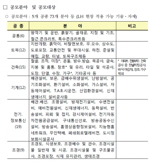 À̹ø °ø¸ð ´ë»óÀº Á¤ºÎ ÀÎÁõÀ̳ª ±¹³» ƯÇ㸦 ¹ÞÀº ½Å±â¼ú¤ý½ÅÀÚÀç·Î Åä¸ñ¤ý°ÇÃà¤ý±â°è¤ýÀü±âÅë½Å¤ýÁ¶°æ µî LH ÇöÀå¿¡ Àû¿ëµÇ´Â 5°³ °øÁ¾, 73°³ °ø»ç ºÐ¾ß´Ù.