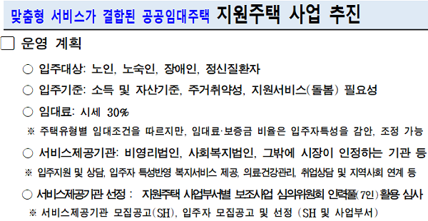 ·ùÈÆ ¼¿ï½Ã ÁÖÅðÇÃົºÎÀåÀº “Áö¿øÁÖÅÃÀº ÁÖÅðú ¼ö¿äÀÚ°¡ ÇÊ¿äÇÑ Áö¿øÀ» ¸ÂÃãÇüÀ¸·Î Á¦°øÇÏ´Â ¼ºñ½º°¡ °áÇÕµÈ »õ·Î¿î °ø°øÀÓ´ëÁÖÅà ¸ðµ¨ÀÌ´Ù. Áö¿øÁÖÅÃÀ» ÅëÇØ ½Ã¼³º¸È£¿¡¼ ¹þ¾î³ª Áö¿ª»çȸ¿¡¼ µ¶¸³ÀûÀÎ »ýȰÀ» ÇÒ ¼ö ±âȸ¸¦ È®´ëÇÏ´Â º¹ÁöÁ¤Ã¥ÀÇ »õ·Î¿î ÆÐ·¯´ÙÀÓÀ» ¿¾î°¡°Ú´Ù”¸ç “Áö¿øÁÖÅà ¹°·® È®´ë¸¦ À§ÇØ ÇöÀç ¸ÅÀÔÀÓ´ëÁÖÅÃ»Ó ¾Æ´Ï¶ó °Ç¼³Çü °ø°øÀÓ´ëÁÖÅÃÀ̳ª »çȸÁÖÅñîÁö ¹üÀ§¸¦ È®´ëÇØ³ª°¡°Ú´Ù. ¾Æ¿ï·¯ Áö¼Ó°¡´ÉÇÑ ¼öÇýÀÚ ¸ÂÃãÇü ÁְŸ𵨠¸¶·ÃÀ» À§ÇØ ÁÖ°ÅÁ¤Ã¥ÀÇ ºÐ±ÇȰ¡ È®´ëµÇ±â¸¦ ±â´ëÇÑ´Ù”°í ¸»Çß´Ù.