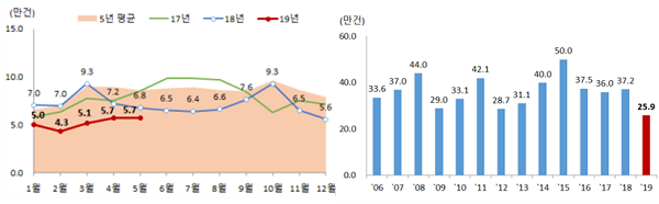 ¿ÃÇØ µé¾î 5¿ù±îÁö ´©°è ÁÖÅà ¸Å¸Å°Å·¡·®µµ 25¸¸9215°ÇÀ¸·Î Áö³ÇØ °°Àº ±â°£(37¸¸2368°Ç) ´ëºñ 30.4%, 5³â Æò±Õ(40¸¸1462°Ç) ´ëºñ 35.4% °¢°¢ ÁÙ¾ú´Ù.