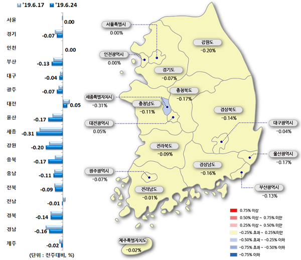 Àü±¹ ¾ÆÆÄÆ®°ªÀº Áö³ÁÖ¿Í µ¿ÀÏÇÏ°Ô 0.07% ³»·È´Ù. ´ëÀü(0.05%)Àº »ó½ÂÇß°í, ¼¼Á¾(-0.31%), °¿ø(-0.2%), ÃæºÏ(-0.17%), ¿ï»ê(-0.17%), °æ³²(-0.16%), °æºÏ(-0.14%), ºÎ»ê(-0.13%) µîÀº Ç϶ôÇß´Ù.