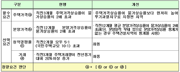 ÇöÇà ¡¸ÁÖÅùý ½ÃÇà·É¡¹¿¡ µû¸£¸é ¹Î°£ÅÃÁö¿¡ ºÐ¾ç°¡»óÇÑÁ¦°¡ ½ÃÇàµÇ·Á¸é Á÷Àü 3°³¿ù°£ ¾ÆÆÄÆ® ¸Å¸Å°¡°Ý »ó½Â·üÀÌ Æò±Õ ¼ÒºñÀÚ¹°°¡ »ó½Â·üÀÇ µÎ ¹è¸¦ ÃʰúÇØ¾ß ÇÑ´Ù. ÀÌ¿Í ÇÔ²² ¡ãÃÖ±Ù 1³â°£ ÇØ´ç Áö¿ªÀÇ Æò±Õ ºÐ¾ç°¡ »ó½Â·üÀÌ ¹°°¡»ó½Â·üÀÇ 2¹è¸¦ ÃʰúÇϰųª ¡ãºÐ¾çÀÌ ÀÖ¾ú´ø Á÷Àü 2°³¿ù°£ ÇØ´ç Áö¿ª¿¡ °ø±ÞµÇ´Â ÁÖÅÃÀÇ ¿ùÆò±Õ û¾à°æÀï·üÀÌ ¸ðµÎ 5´ë 1À» Ãʰú, ¶Ç´Â ±¹¹ÎÁÖÅñԸð(85§³) ÀÌÇÏÀÇ ¿ùÆò±Õ û¾à°æÀï·üÀÌ ¸ðµÎ 10´ë 1À» ÃʰúÇÑ Áö¿ª ¡ãÁ÷Àü 3°³¿ù°£ ÁÖÅà °Å·¡·®ÀÌ Àü³â µ¿±âº¸´Ù 20% ÀÌ»ó Áõ°¡ÇÏ´Â µî 3°¡Áö ºÎ°¡Á¶°Ç Áß Çϳª¸¦ ÃæÁ·ÇÏ¸é µÈ´Ù.