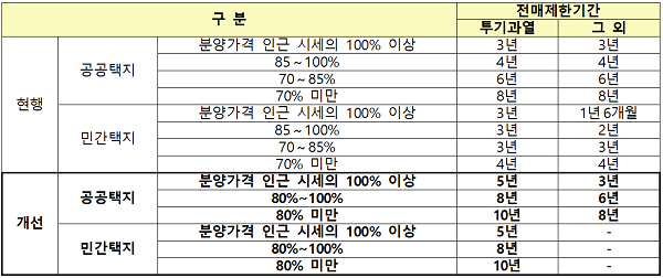 ¾Æ¿ï·¯ ‘·Î¶Ç û¾à’ µîÀÇ ºÎÀÛ¿ëÀ» ¸·±â À§ÇØ ºÐ¾ç°¡ Àû¿ë ÁÖÅÃÀÇ Àü¸ÅÁ¦ÇÑ ±âÇÑÀ» ´ëÆø ´Ã¸®±â·Î Çß´Ù. ÇöÀç ¼öµµ±Ç Åõ±â°ú¿Áö±¸ ³» ¹Î°£ÅÃÁö ºÐ¾ç°¡»óÇÑÁ¦ Àû¿ë ÁÖÅÃÀÇ Àü¸ÅÁ¦ÇѱⰣÀº 3~4³âÀÌ´Ù. À̸¦ Àα٠ÁÖÅà ½Ã¼¼ ´ëºñ ºÐ¾ç°¡ ¼öÁØ¿¡ µû¶ó 5~10³âÀ¸·Î ´Ã¸®±â·Î Çß´Ù. ¼¼ºÎÀûÀ¸·Î´Â ¡ãºÐ¾ç°¡°Ý Àα٠½Ã¼¼ 100% ÀÌ»ó 5³â ¡ã80~100% 8³â ¡ã80% ¹Ì¸¸ 10³âÀÌ´Ù.