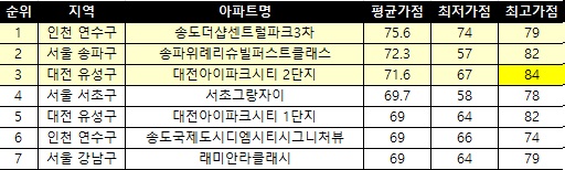 Áö³ 21ÀÏ KBºÎµ¿»ê ¸®ºê¿Â(Liiv ON)¿¡ µû¸£¸é Àü±¹ ¾ÆÆÄÆ®º° 2019³â Æò±Õ û¾à°¡Á¡ ºÐ¼® °á°ú »óÀ§ ¾ÆÆÄÆ®¿¡¼ Æò±Õ °¡Á¡ÀÌ 70Á¡À» Èǽ ³Ñ´Â °æ¿ì°¡ ¸¹¾Ò´Ù. ƯÈ÷ ´ëÀü À¯¼º±¸ ‘´ëÀü¾ÆÀÌÆÄÅ©½ÃƼ 2´ÜÁö’ÀÇ ÃÖ°í°¡Á¡Àº 84Á¡, ¼¿ï ¼ÛÆÄ±¸ ‘¼ÛÆÄÀ§·Ê¸®½´ºôÆÛ½ºÆ®Å¬·¡½º’ÀÇ ÃÖ°í °¡Á¡Àº 82Á¡À¸·Î û¾àÁ¡¼ö ÃÖ°í °¡Á¡ÀÌ 80Á¡À» ¿ôµµ´Â ¾ÆÆÄÆ®µµ ÀÖ¾ú´Ù.