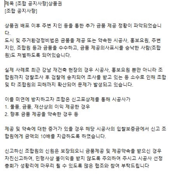 YTNÀÇ º¸µµ¿¡ µû¸£¸é dzÇⱸ¿ª Àç°³¹ß ½Ã°øÀÚ¼±Á¤ÃÑȸ ÀÌÆ² Àü °Ç¼³»ç È«º¸Á÷¿øÀÌ Á¶ÇÕ¿ø¿¡°Ô µ· ºÀÅõ¸¦ °Ç³×´Â ¸ð½ÀÀÌ Æ÷ÂøµÆ´Ù. ½Ã°øÀÚ ¼±Á¤¿¡¼ ±ÝǰÀ» »ìÆ÷ÇÑ Á¡ÀÌ µå·¯³ ºÎºÐÀÌ´Ù. ÀϺΠ°ü°èÀÚµéÀº ÃÖ±Ù±îÁö ¹ú¾îÁø Æ÷½ºÄڰǼ³ÀÇ °ø°ÝÀûÀÎ ¼öÁÖ Çຸ¿¡ µû¸¥ ¿¹°ßµÈ ¼ö¼øÀ̶ó°í ÇØ¼®Çß´Ù.