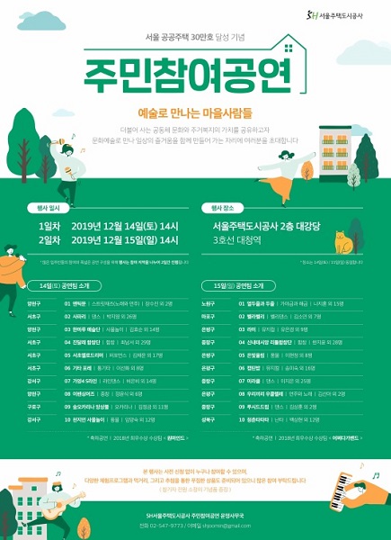 ¼¿ïÁÖÅõµ½Ã°ø»ç(SH°ø»ç)´Â °ø°øÁÖÅà 30¸¸ °¡±¸ ´Þ¼ºÀ» ±â³äÇÏ´Â ÁÖ¹ÎÂü¿©°ø¿¬ ‘¿¹¼ú·Î ¸¸³ª´Â ¸¶À»»ç¶÷µé’À» ¿À´Â 14ÀϺÎÅÍ 15ÀÏ ÀÌÆ²°£ °³Æ÷µ¿ º»»ç¿¡¼ °³ÃÖÇÑ´Ù°í ¹àÇû´Ù.