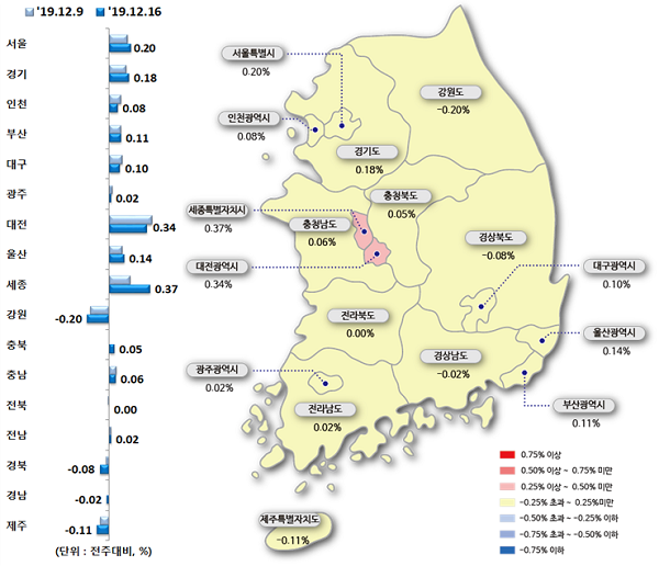 Áö¹æ(0.06%)Àº Áö³ÁÖ »ó½ÂÆøÀ» À¯ÁöÇß´Ù. ½Ã¤ýµµº°·Î ¼¼Á¾(0.37%), ´ëÀü(0.34%), ¿ï»ê(0.14%) µîÀº »ó½ÂÇß°í, ÀüºÏÀº º¸ÇÕ, °¿ø(-0.2%), Á¦ÁÖ(-0.11%), °æºÏ(-0.08%), °æ³²(-0.02%) µîÀº Ç϶ôÇß´Ù.