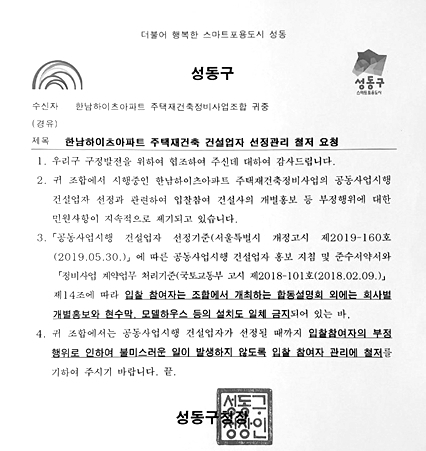 ÃÖ±Ù ¾÷°è ¼Ò½ÄÅë µî¿¡ µû¸£¸é ¼ºµ¿±¸´Â Áö³ÇØ 12¿ù ¸» ¿Á¼öÇѳ²ÇÏÀÌÃ÷ Àç°ÇÃà Á¶ÇÕÀÇ ½Ã°øÀÚ ¼±Á¤ ÀÔÂû¿¡ Âü¿©ÇÑ Çö´ë°Ç¼³ Ãø¿¡ °ø¹®À» ¹ß¼ÛÇß´Ù. ÇØ´ç °ø¹®Àº Çö´ë°Ç¼³ÀÇ ºÒ¹ýÀûÀÎ È«º¸¿¡ ´ëÇÑ Á¶ÇÕ¿ø ¹Î¿øÀ» ¹Ý¿µÇÑ °ÍÀ¸·Î ¾Ë·ÁÁ³´Ù. ÀÌ´Â ±¹Åä±³ÅëºÎ(Àå°ü ±èÇö¹Ì)¿¡¼ ¡¸°øµ¿»ç¾÷½ÃÇà °Ç¼³¾÷ÀÚ ¼±Á¤±âÁØ¡¹, ¡¸Á¤ºñ»ç¾÷ °è¾à¾÷¹« 󸮱âÁØ¡¹ µîÀ» ¸¶·ÃÇØ °Ç¼³»ç°¡ Á¶ÇÕÀÌ ¸¶·ÃÇÑ ÇÕµ¿È«º¸¼³¸íȸ ¿Ü ȸ»çÀÇ °³º°ÀûÀÎ È«º¸¿Í Çö¼ö¸·, º»º¸±â Áý(È«º¸°ü) ¼³Ä¡ µîÀ» ±ÝÁöÇ߱⠶§¹®ÀÌ´Ù.