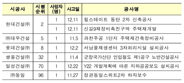 ÀÌ ¹Û¿¡ ´ë¿ì°Ç¼³, ·Ôµ¥°Ç¼³, ½Ö¿ë°Ç¼³, Àϼº°Ç¼³, µ¿ÀÏÀÇ ÇöÀå¿¡¼µµ °¢°¢ 1¸íÀÇ »ç°í»ç¸ÁÀÚ°¡ ¹ß»ýÇÏ´Â µî °°Àº ±â°£ µ¿¾È ½Ã°ø´É·ÂÆò°¡ »óÀ§ 100À§ Áß 6°³ ȸ»ç¿¡¼ 7¸íÀÇ »ç°í»ç¸ÁÀÚ°¡ ¹ß»ýÇß´Ù.