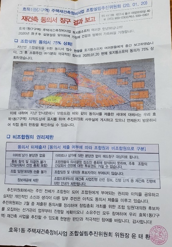 ÃÖ±Ù µµ½ÃÁ¤ºñ¾÷°è¿¡ µû¸£¸é ¿ëµÎ7±¸¿ª Àç°ÇÃà Á¤ºñ»ç¾÷Á¶ÇÕ(ÀÌÇÏ Á¶ÇÕ) ¼³¸³ÃßÁøÀ§¿øÈ¸(ÀÌÇÏ ÃßÁøÀ§)´Â ÀÌ´Þ 20ÀÏ Á¶ÇÕ¼³¸³µ¿ÀǼ 75%¸¦ ¿ôµ¹¾Ò´Ù. ÅäÁöµî¼ÒÀ¯ÀÚ µîÀº ÃßÁøÀ§ »ç¹«½ÇÀ» ã¾Æ Á÷Á¢ µ¿ÀÇ ÇöȲÀ» È®ÀÎÇÒ ¼ö ÀÖ´Ù.