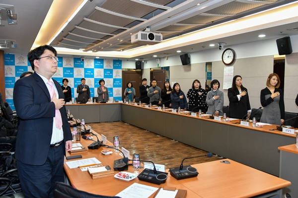 | ¡ã À̰ü¼ö ÀÇÀå°ú »çȸº¹Áö±â°üÇùÀÇȸ Á¾»çÀÚµéÀÌ °£´ãȸ¸¦ ½ÃÀÛÇϱâ Àü ±¹±â¿¡ ´ëÇÑ °æ·Ê¸¦ Çϰí ÀÖ´Ù. <Á¦°ø=°³²±¸ÀÇȸ> |