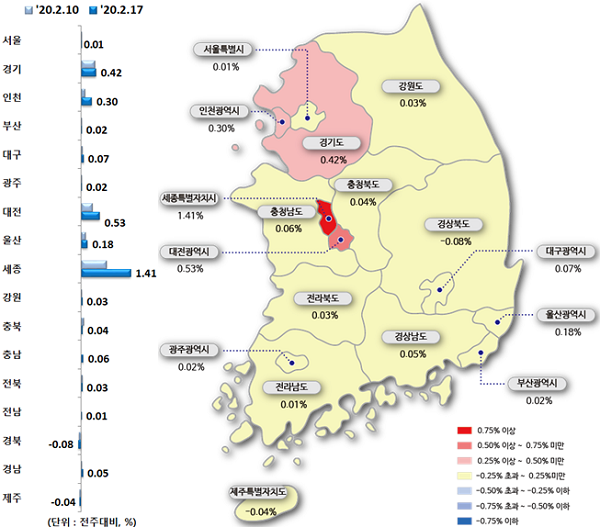 Áö¹æ(0.08%)Àº Áö³ÁÖ(0.06%) ´ëºñ »ó½ÂÆøÀÌ Ä¿Á³´Ù. ½Ã¤ýµµº°·Î ¼¼Á¾(0.72%), ´ëÀü(0.32%), ¿ï»ê(0.24%), Ãæ³²(0.1%), ´ë±¸(0.08%), °¿ø(0.06%) µîÀº »ó½ÂÇß°í, Á¦ÁÖ(-0.03%), °æºÏ(-0.02%) µîÀº Ç϶ôÇß´Ù.