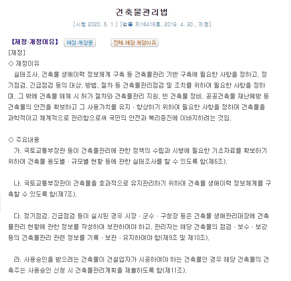 ±¹Åä±³ÅëºÎ(ÀÌÇÏ ±¹ÅäºÎ)´Â ¿À´Â 5¿ù 1ÀϺÎÅÍ ½ÃÇàµÇ´Â ¡¸°ÇÃ๰°ü¸®¹ý¡¹¿¡ µû¶ó °ÇÃ๰°ü¸®¸¦ À§ÇÑ Á¤Ã¥°ú ±â¼úÀÇ ¿¬±¸¤ý°³¹ß ¹× º¸±Þ µîÀ» È¿À²ÀûÀ¸·Î ÃßÁøÇϱâ À§ÇØ Çѱ¹½Ã¼³¾ÈÀü°ø´Ü, Çѱ¹ÅäÁöÁÖÅðø»ç(LH)¸¦ °ÇÃ๰°ü¸®Áö¿ø¼¾ÅÍ·Î ÁöÁ¤Çß´Ù.